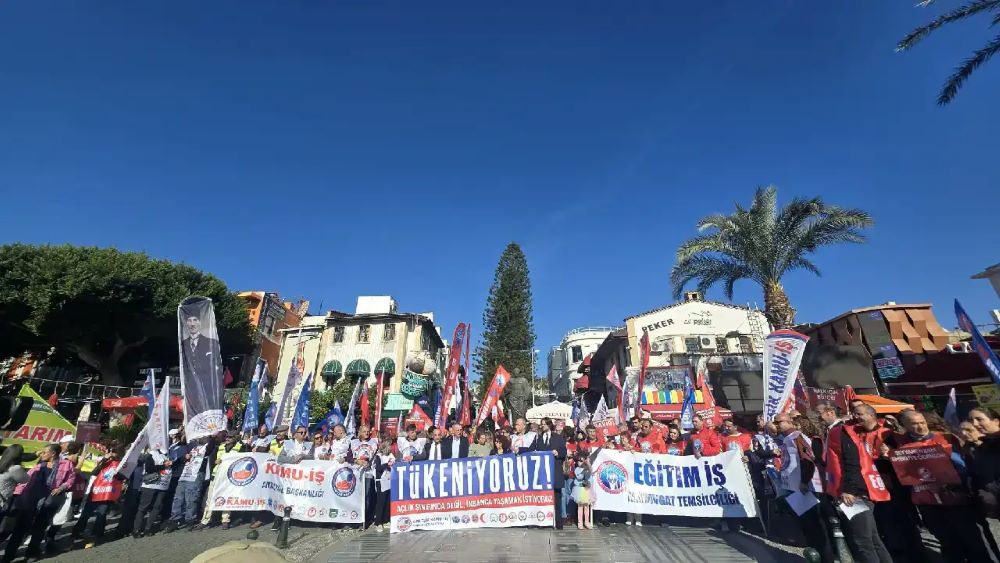 Antalya’da Attalos Meydanı’nda toplanan Birleşik Kamu İş’liler “tükeniyoruz” diyerek iktidara uyarıda bulunmak amacıyla iş bıraktıklarını ifade ettiler.