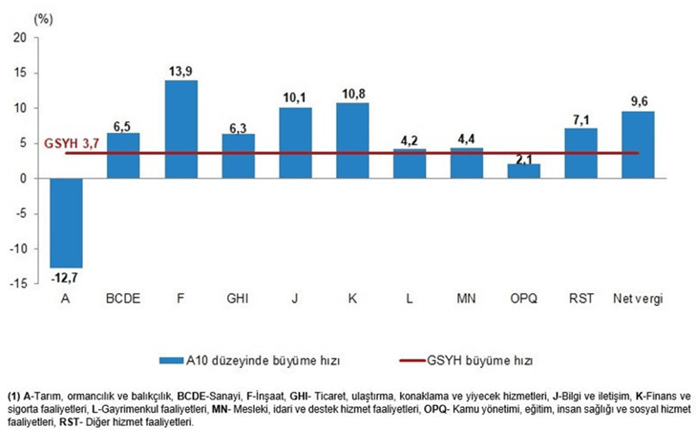 (Temmuz-eylül döneminden oluşan) yılın üçüncü çeyreğine ilişkin gayrisafi yurt içi hasıla (GSYH) sonuçlarını açıklayan Türkiye İstatistik Kurumu (TÜİK) verilerine göre tarım dışındaki tüm sektörler büyüdü, tarım sektörü ise bir önceki yılın aynı çeyreğine göre yüzde 12,7 küçüldü.