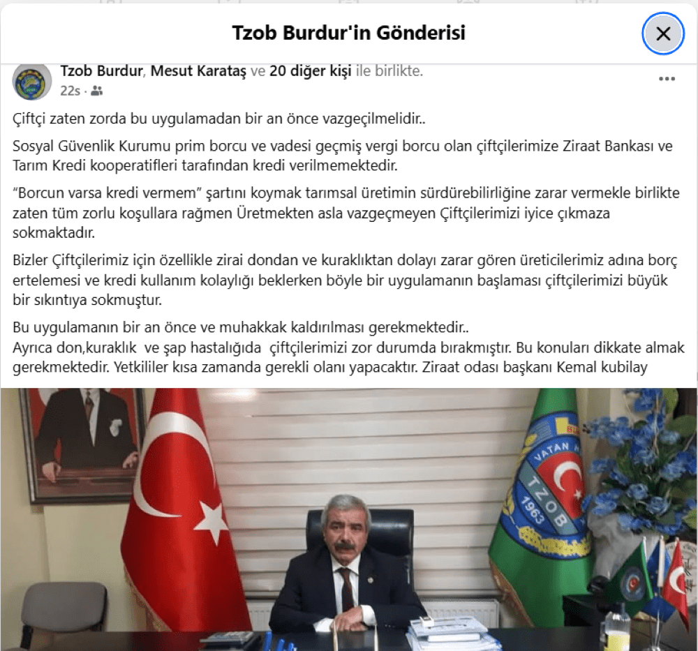 “Çiftçilerimiz başta zirai don kuraklık hastalık ve ekonomik şartlar nedeniyle üretimi sürdürebilmek için krediye acilen ihtiyaç duymaktadır. ‘Borcun varsa kredi vermem’ şartını koymak tarımsal üretimin sürdürülebilirliğine zarar verir. Biz çiftçilerimiz için borç ertelemesi beklerken böyle bir uygulamanın başlaması üreticilerimizi büyük bir sıkıntıya sokmuştur.