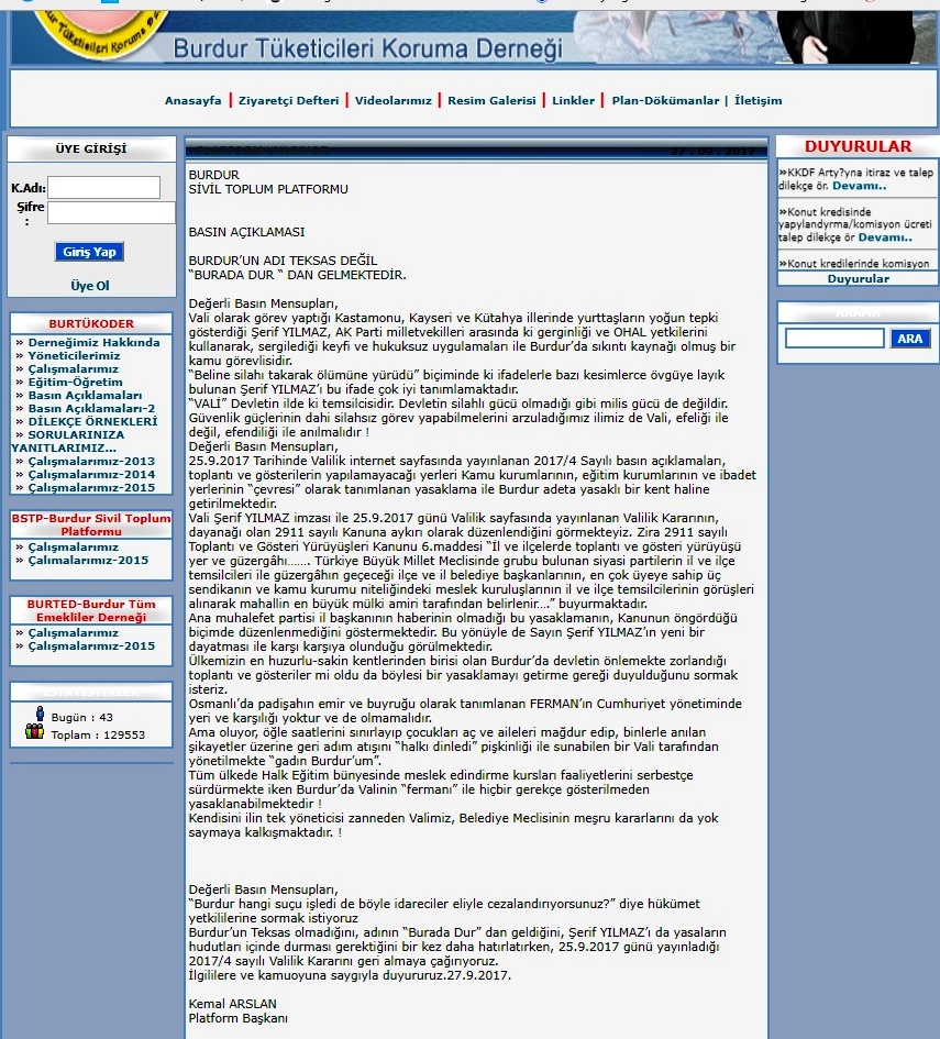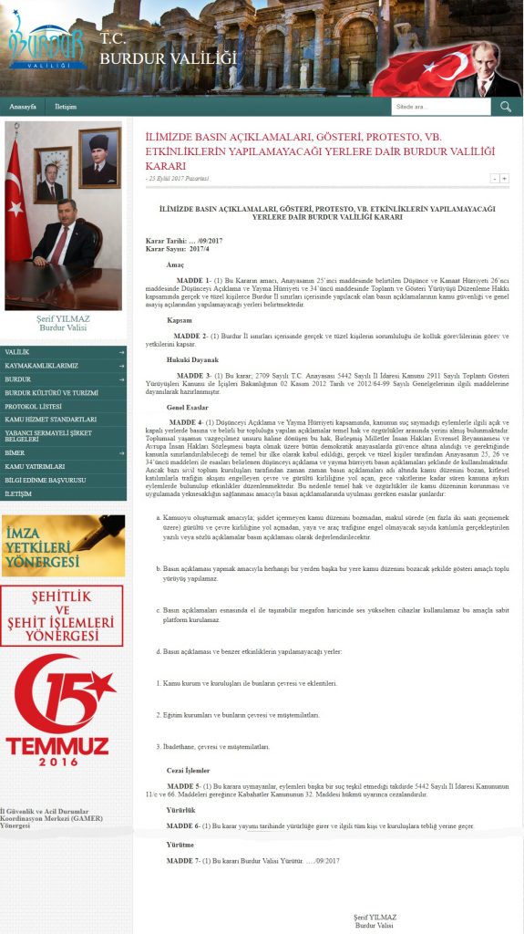 “Vali olarak görev yaptığı Kastamonu, Kayseri ve Kütahya illerinde yurttaşların yoğun tepki gösterdiği Şerif Yılmaz”ın, “AK Parti milletvekilleri arasındaki gerginliği ve OHAL yetkilerini kullanarak sergilediği keyfi ve hukuksuz uygulamalarıyla Burdur’da sıkıntı kaynağı olmuş bir kamu görevlisi olduğu”nu vurgulayan Kemal Arslan, Valiliğin, “25.9.2017 tarihinde Valilik internet sayfasında yayınlanan 2017/ 4 Sayılı basın açıklamaları, toplantı ve gösterilerin yapılamayacağı yerleri kamu kurumlarının, eğitim kurumlarının ve ibadet yerlerinin ‘çevresi’ olarak tanımlanan yasaklama”sına tepki gösterdi. Arslan, Valiliğin toplumsal eylemlerin yapılamayacağı yerler kararının, karara dayanak olduğu belirtilen 2911 Sayılı Kanuna aykırı olarak düzenlenmiş olduğunu ileri sürdü. 2911 Sayılı Toplantı ve Gösteri Yürüyüşleri Kanunu’nun 6’ncı maddesinde, “il ve ilçelerde toplantı ve gösteri yürüyüşü yer ve güzergâhı (…) Türkiye Büyük Millet Meclisi’nde grubu bulunan siyasi partilerin il ve ilçe temsilcileri ile güzergâhın geçeceği ilçe ve il belediye başkanlarının, en çok üyeye sahip üç sendikanın ve kamu kurumu niteliğindeki meslek kuruluşlarının il ve ilçe temsilcilerinin görüşleri alınarak mahallin en büyük mülki amiri tarafından belirlenir (…)” denildiğini belirten Arslan, “Anamuhalefet partisi il başkanının bile haberinin olmadığı bu yasaklamanın, Kanunun öngördüğü biçimde düzenlenmediğini göstermektedir. Bu yönüyle de Sayın Şerif Yılmaz’ın yeni bir dayatması ile karşı karşıya olunduğu görülmektedir” değerlendirmesinde bulundu.