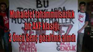 Başbakan ve AKP genel başkanı Ahmet Davutoğlu’nun dün ilimizde gerçekleştirdiği miting esnasında “Bu topraklarda Mustafa Kemaller yenilmez” pankartı açan 2 Öncü Gençlik üyesi genç polis tarafından gözaltına alındı. Dün (12 Mayıs 2015 günü) ilimizi yığdığı polislerle ve bariyerlerle cehenneme çeviren gerçekleştirdiği mitinginde Başbakan ve AKP Genel Başkanı Ahmet Davutoğlu konuşurken 2 Öncü Genç üyesi yolda […]