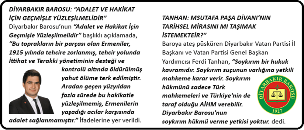“-1915 olaylarında soykırım işlendiğine dair yetkili mahkeme kararı yoktur. AİHM’de Perinçek–İsviçre davasında Ermeni soykırımı iddialarının uluslararası, tarihsel ve emperyalist bir yalan olduğunu ispat ettik. Ayrıca AİHM, Ermeni soykırımı konusunda uluslararası alanda bir oydaşma bulunmadığına ve Ermeni Olayları’nın Yahudi Soykırımına benzemediğine ilişkin de karar vermiştir. AİHM’nin bu konuda hakikatlere Diyarbakır Barosu’ndan daha bağlı olması ise ibretliktir.