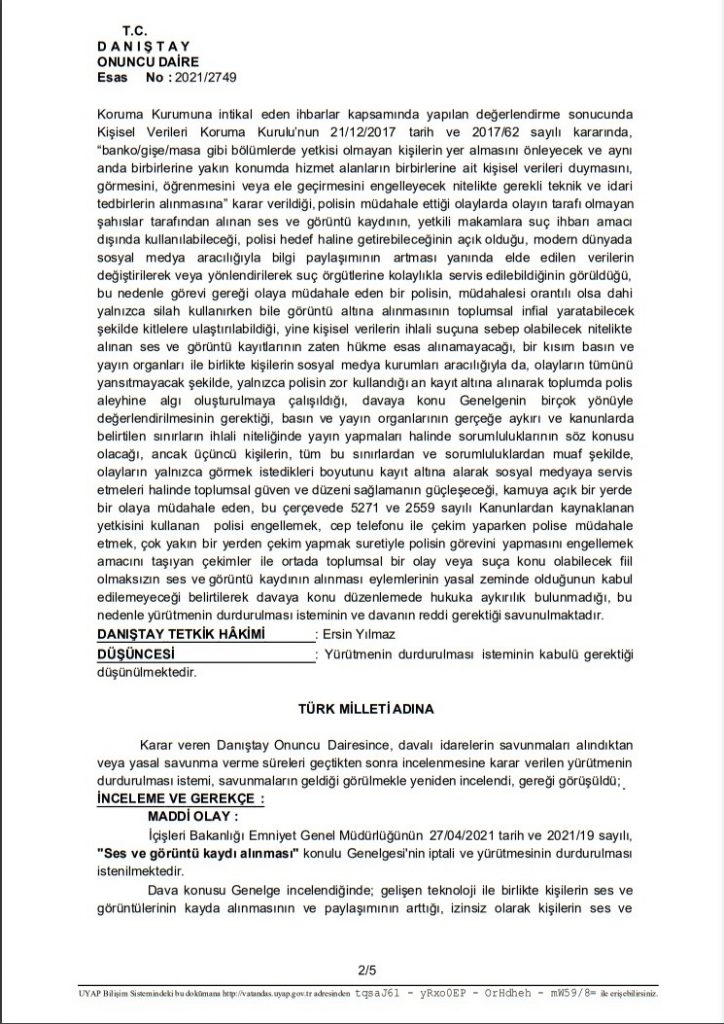 Danıştay, İçişleri Bakanlığı Emniyet Genel Müdürlüğü’nün 27 Nisan 2021 tarih ve 2021/19 sayılı “Ses ve Görüntü alınması” konulu Genelgesi’ni, Burdur Barosunun açtığı dava sonucu iptal ederek yürütmesi durdurdu.