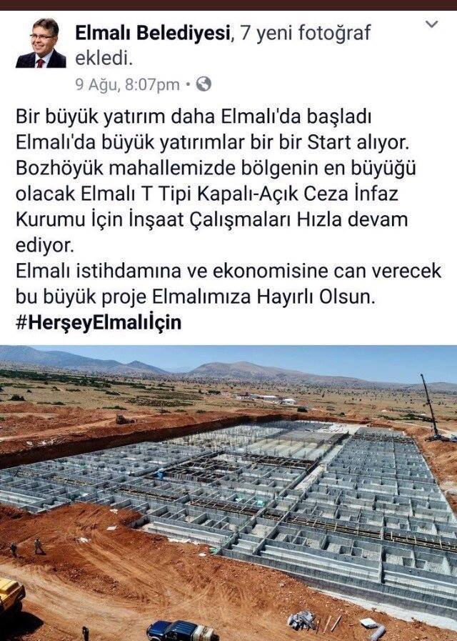 Sosyal medyada, işkence ve eziyeti, insan denilen toplumsal varlığa en büyük ceza olan toplumdan tecridi sağlayan insanlık dışı dramı da içeren bir öze sahip cezaevi inşaatıyla övünen, cezaevi inşasını “yatırım” olarak gören hastalıklı bir zihniyetin dışa vurumu, AKP’li Antalya/ Elmalı Belediyesi’nin resmi Facebook sayfasında ortaya çıktı. Belediye’nin resmi Facebook sayfasında, “bölgenin en büyük” cezaevi olacağı belirtilen Elmalı Bozhöyük Mahallesindeki Elmalı T Tipi kapalı-Açık Ceza İnfaz Kurumu’nun inşaatının başlamasını, “bir büyük yatırım daha Elmalı’da başladı” şeklindeki paylaşım, yüzkarası bir zihniyet olarak değerlendirildi.