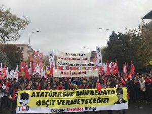 ‘Açtığın yolda gösterdiğin hedefe durmadan yürüyeceğime andiçerim’ ve ‘Atatürksüz müfredata geçit vermeyeceğiz’ pankartlarıyla yürüyen Türkiye Liseliler Birliği (TLB), alkışlarla karşılandı.