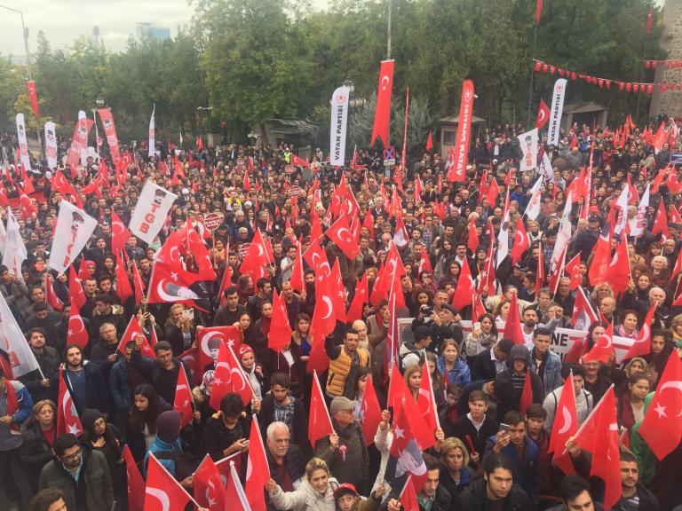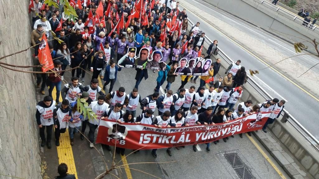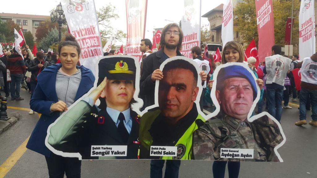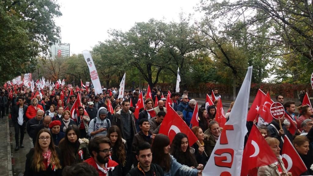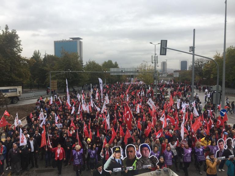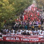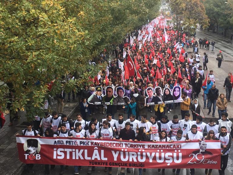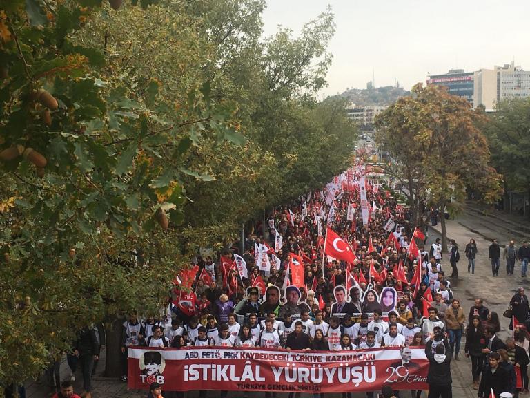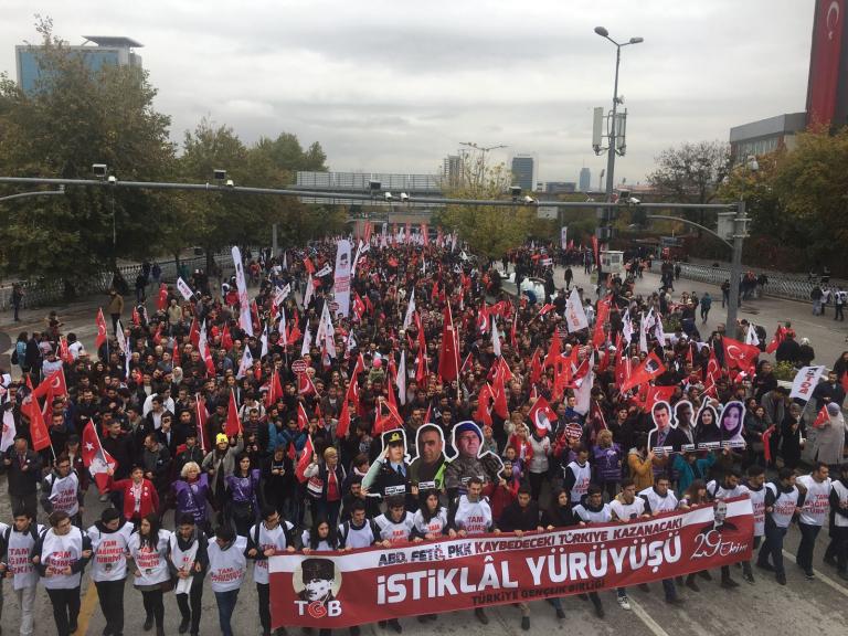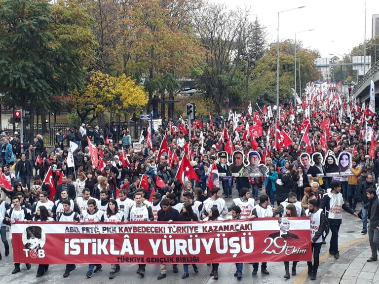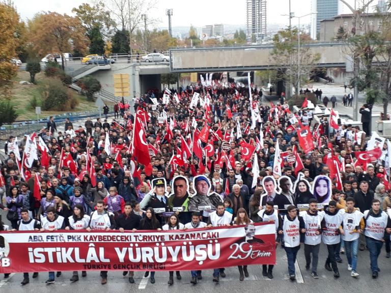 ”ABD, FETÖ, PKK kaybediyor, Türkiye Cumhuriyeti kazanacak” pankartı arkasında yürüyen TGB’lilerin Anıtkabir’e yürüyüşünde kortej iyice büyüdü. On binlerce Ankaralı elde bayraklarla sokakları inleterek Anıtkabir’e vardı.