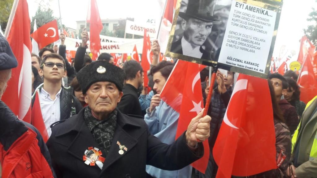 Taşıdıkları ‘Amerika’dan İstemez Vize İstiklalimiz Yeter Bize, İstiklal Vizemizi Atatürk’ten Aldık, Milli Eğitim Milli Müfredat’ yazılı dövizler halkın ilgisini topladı.