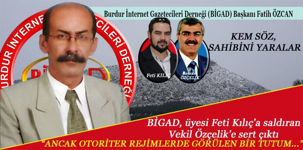 AKP Milletvekili Bayram Özçelik, Burdur İnternet Gazetecileri Derneği (BİGAD) üyesi, Çağdaş Gazetesi Genel yayın Yönetmeni, Kanal32 Temsilcisi ve Hbr15 İnternet Gazetesi sahibi Feti Kılıç’a, AKP İl Başkanı Dr. Süleyman Faki’nin atanmasını kutlamamasını konu alan bir haberi nedeniyle sosyal medya üzerinden “terbiyesiz” diye hakaret etti ve saldırıda bulundu. Salt haber yaptığı ve halkın haber alma hakkını kullandığı için hakarete uğrayan üyesine sahip çıkan Burdur İnternet Gazetecileri Derneği (BİGAD) Başkanı Fatih Özcan yazılı bir açıklama yaparak, “kem söz sahibini yaralar. Demokratik toplumun olmazsa olmazı, ifade, basın ve düşünce hürriyetini ayaklar altına alan bu saldırı kabul edilemez” dedi.