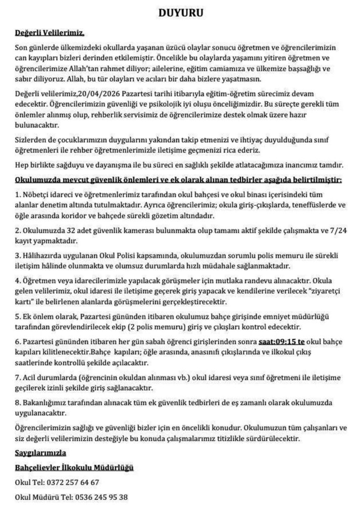 Bazı okul müdürleri, İl Milli Eğitim Müdürlükleriyle yapılan toplantının ardından aldıkları kararları velilere iletiyor. Örneğin İstanbul’da bir okul aldığı önlemleri şöyle sıraladı: “Değerli velilerimiz, 20 Nisan 2026 Pazartesi tarihi itibariyle eğitim-öğretim sürecimiz devam edecektir. Öğrencilerimizin güvenliği ve psikolojik iyi oluşu önceliğimizdir. Bu süreçte gerekli tüm önlemler alınmış olup, rehberlik servisimiz de öğrencilerimize destek olmak üzere hazır bulunacaktır. Sizlerden çocuklarımızın duygularını yakından takip etmenizi ve ihtiyaç duyulduğunda sınıf öğretmenleri ile rehber öğretmenlerimizle iletişime geçmenizi rica ederiz. Hep birlikte sağduyu ve dayanışma ile bu süreci en sağlıklı şekilde atlatacağımıza inancımız tamdır.