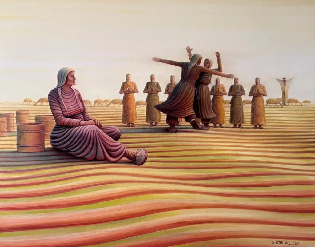 Resimlerini anlatmaya devam eden Karakul, “Kadınların koyun sağdığı bir resim var. Buradaki mesajı şöyle. Koyunları bir çoban birleştirip sürü haline getirir. O sürü, gün içinde belirli bir yere getirilir. Köyün kadınları gidip koyunları sağar ve geri döner. Sürü gelmeden önceki süreçte kadınların sohbetini, halay çekmelerini, dayanışmasını resimlerimizde yansıttık. Kırsal kesimde insanların iş halindeki hareketlerini resimlerime yansıtıyorum.” ifadelerine yer verdi.