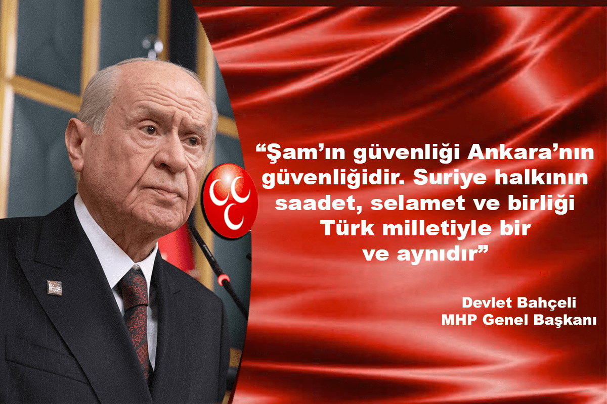 MHP Genel Başkanı Devlet Bahçeli, “Suriye Cumhuriyeti devletinin siyasi ve toprak bütünlüğü, egemenlik haklarıyla iç huzur ve istikrarı tartışılamaz, sulandırılamaz, sakatlanamaz mahiyettedir. Şam’ın güvenliği Ankara’nın güvenliğidir. Suriye halkının saadet, selamet ve birliği Türk milletiyle bir ve aynıdır” dedi.