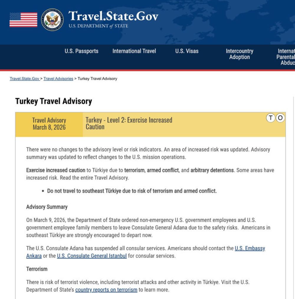 “Amerikan Büyükelçiliği, resmi sosyal medya hesabı üzerinden 9 Mart 2026 (bugün) saat: 13.39’da yayınlanan duyuruda ABD vatandaşlarına “Güneydoğu Türkiye’ye seyahat etmeyin” uyarısında bulunmuş, Adana ABD Konsolosluğundaki ABD hükümeti çalışanları ve aile mensuplarının ayrılmaları talimatını vermiştir.