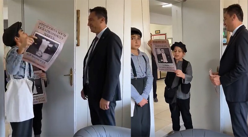 Yeşilova Belediyesi’nde Cumhuriyet Bayramı kutlamaları kapsamında Başkan Okan Kurd’un makam koltuğuna oturtacağı öğrencilerin sıradışı seremonisi belediyede duygusal ve gururlandırıcı anlar yaşanmasına neden oldu. 1923’lerin kıyafetleri içinde, ellerinde gazetelerle “yazıyor, yazıyor! Yarın Cumhuriyet ilan ediliyor!” nidalarıyla ziyarete gelen öğrenciler, yaptıkları canlandırmayla Başkan Kurd ve belediye çalışanlarını duygulandırdı ve gururlandırdı hem de belediyede unutulmaz anlar yaşanmasına sağladı.